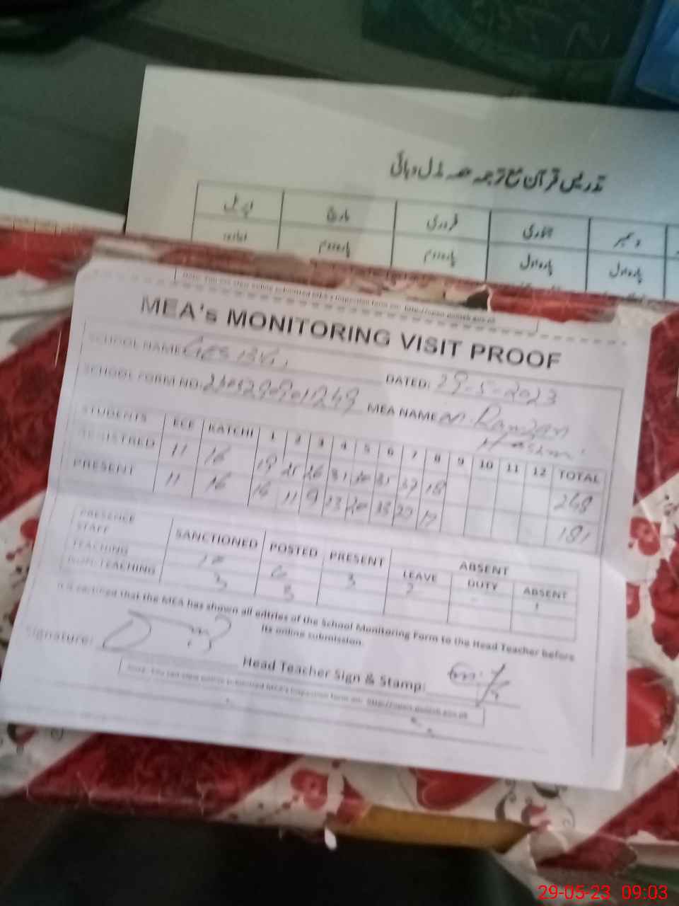 | Attendance Register | Head Teacher | MEA with School | Visit Proof |
