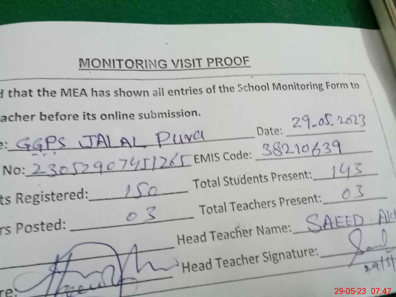 | Attendance Register | Head Teacher | MEA with School | Visit Proof |