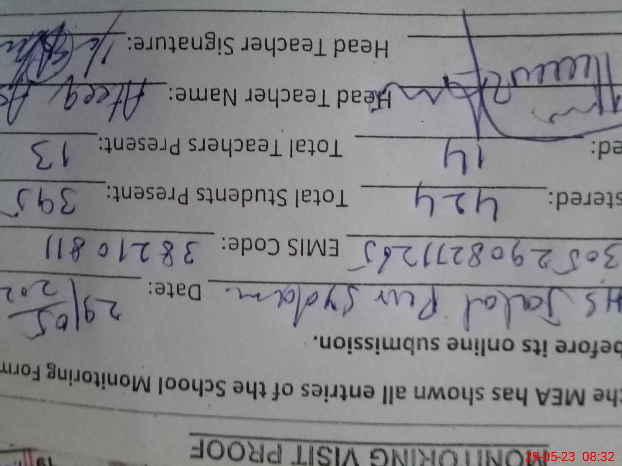 | Attendance Register | Head Teacher | MEA with School | Visit Proof |