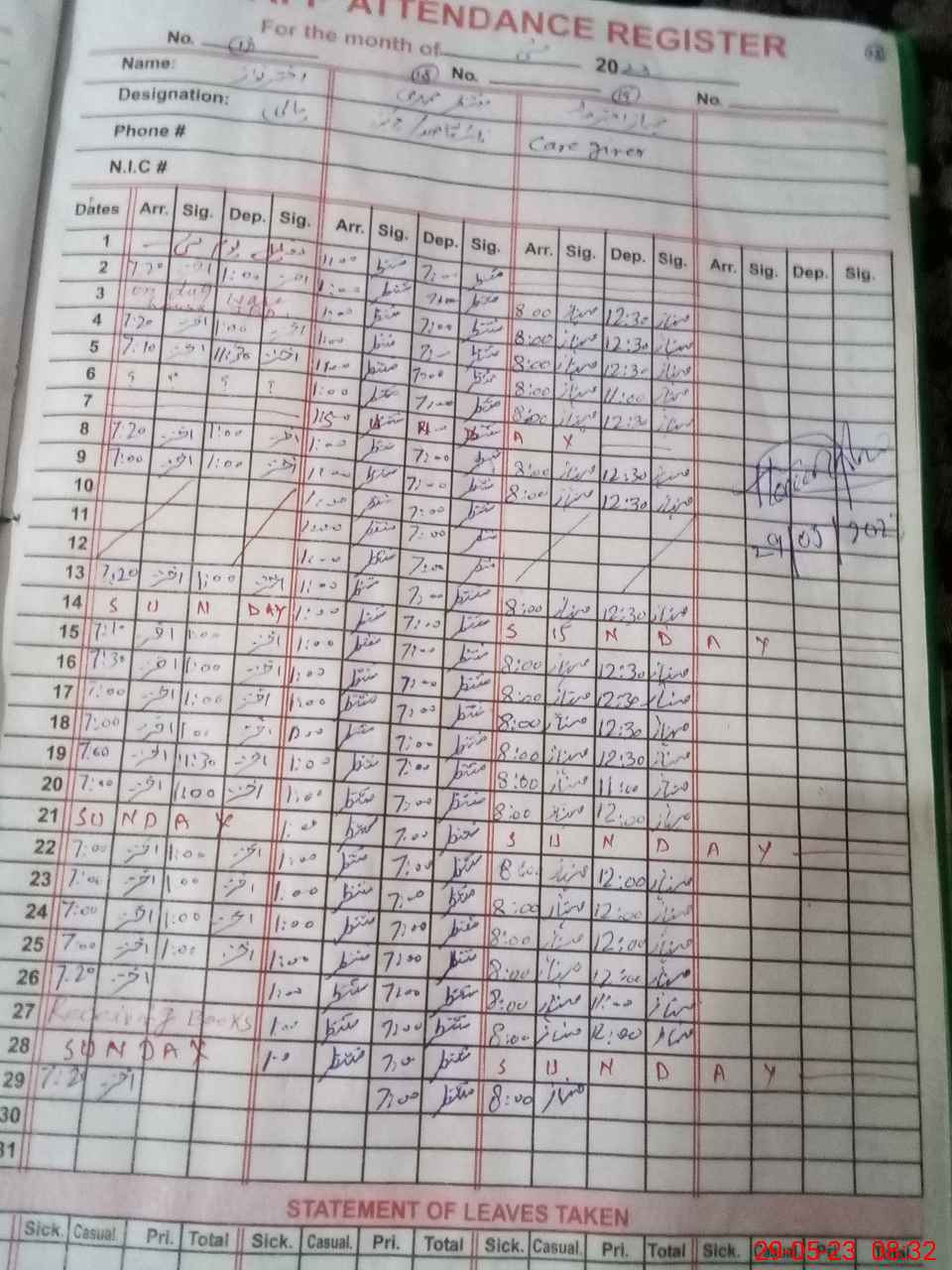 | CNIC | Full Name | Designation | R/C | Absence During Last Calender Month |