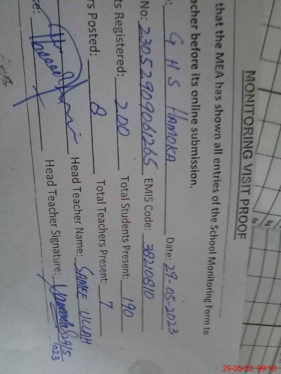 | Attendance Register | Head Teacher | MEA with School | Visit Proof |