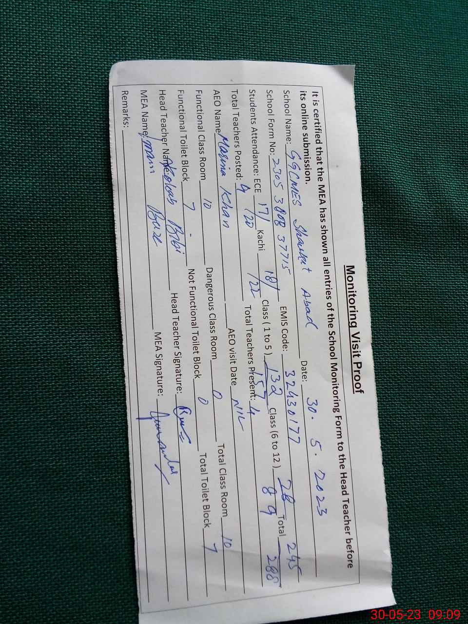 | Attendance Register | Head Teacher | MEA with School | Visit Proof |