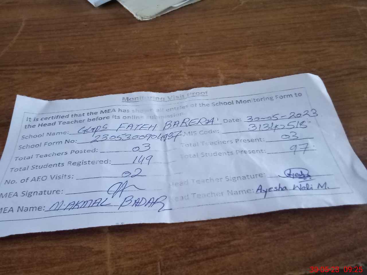 | Attendance Register | Head Teacher | MEA with School | Visit Proof |