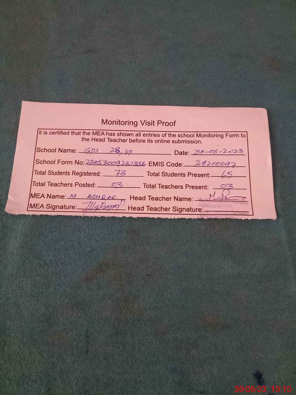 | Attendance Register | Head Teacher | MEA with School | Visit Proof |