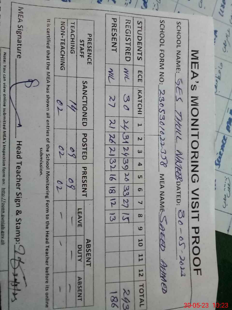 | Attendance Register | Head Teacher | MEA with School | Visit Proof |
