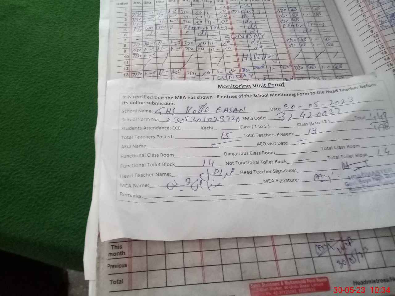 | Attendance Register | Head Teacher | MEA with School | Visit Proof |