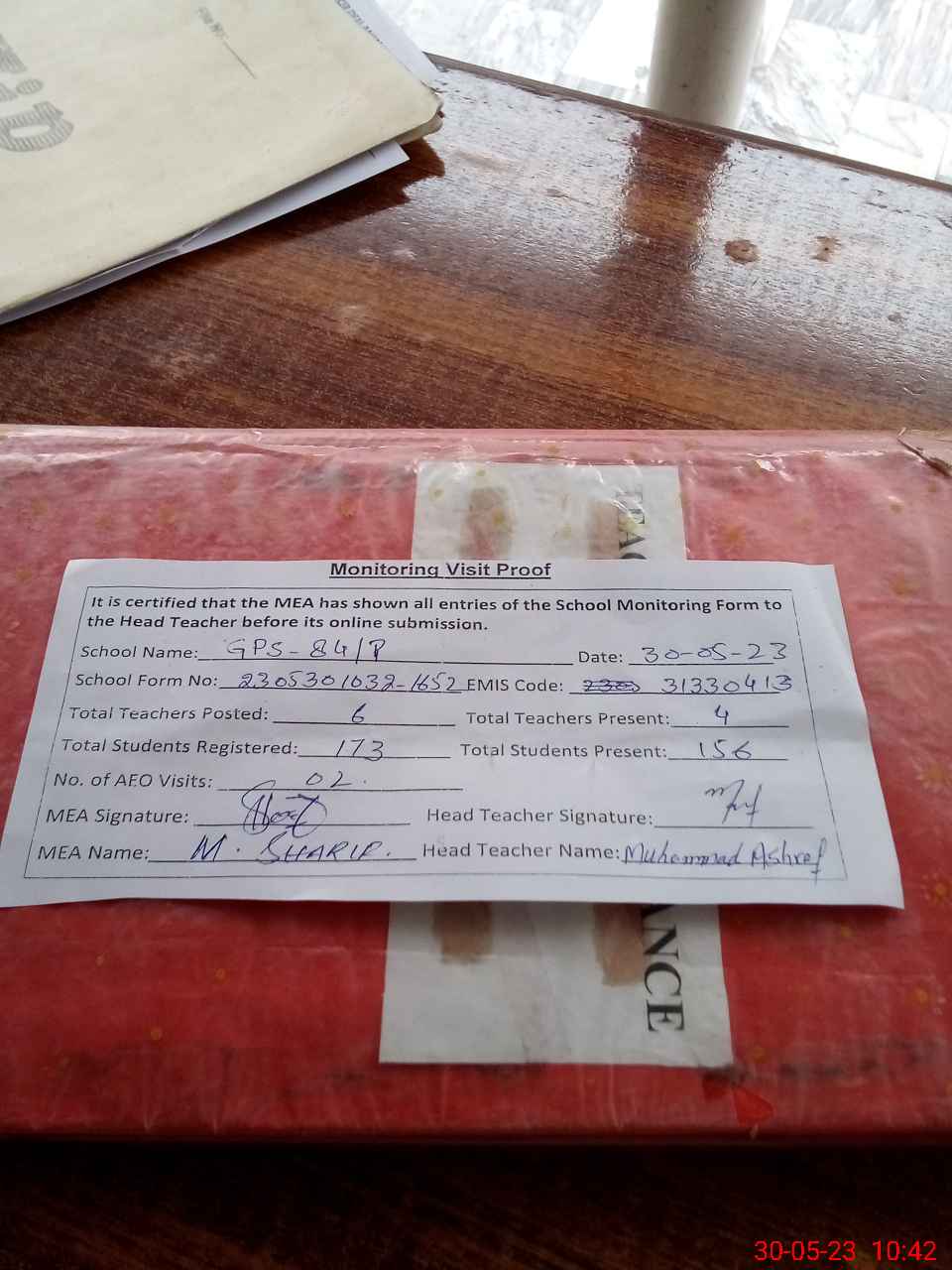 | Attendance Register | Head Teacher | MEA with School | Visit Proof |