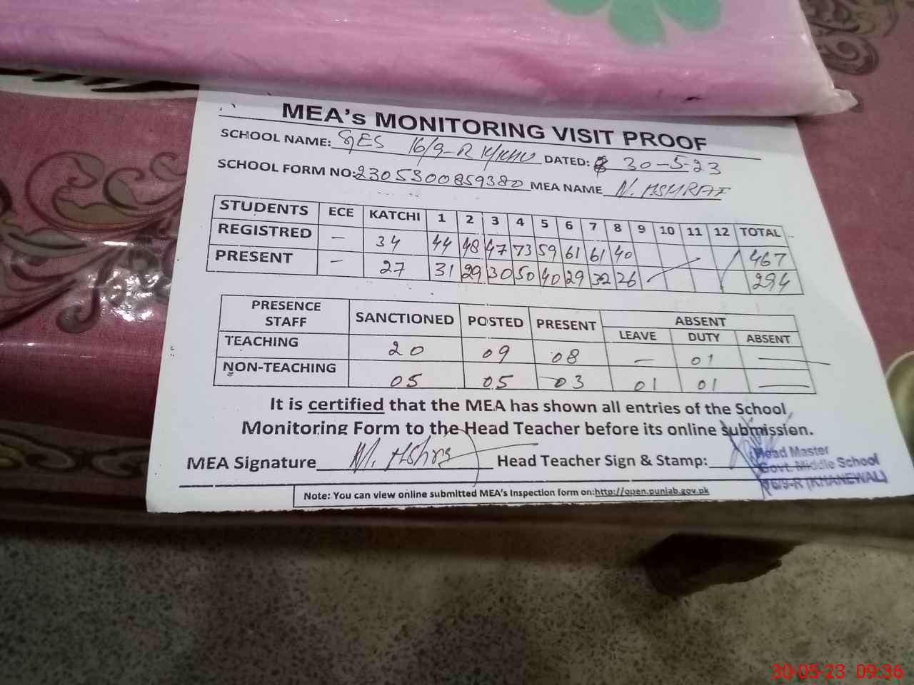 | Attendance Register | Head Teacher | MEA with School | Visit Proof |