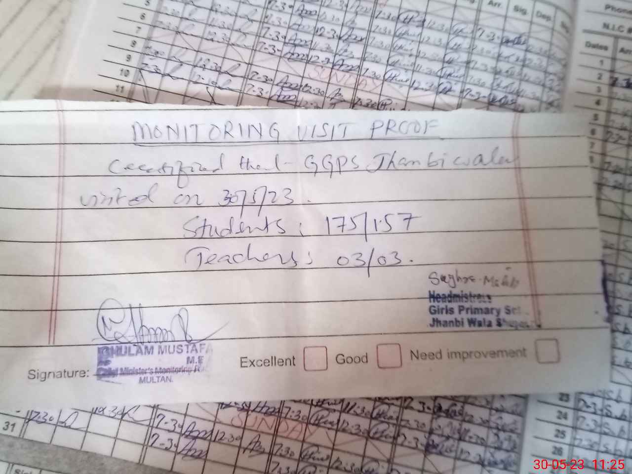 | Attendance Register | Head Teacher | MEA with School | Visit Proof |