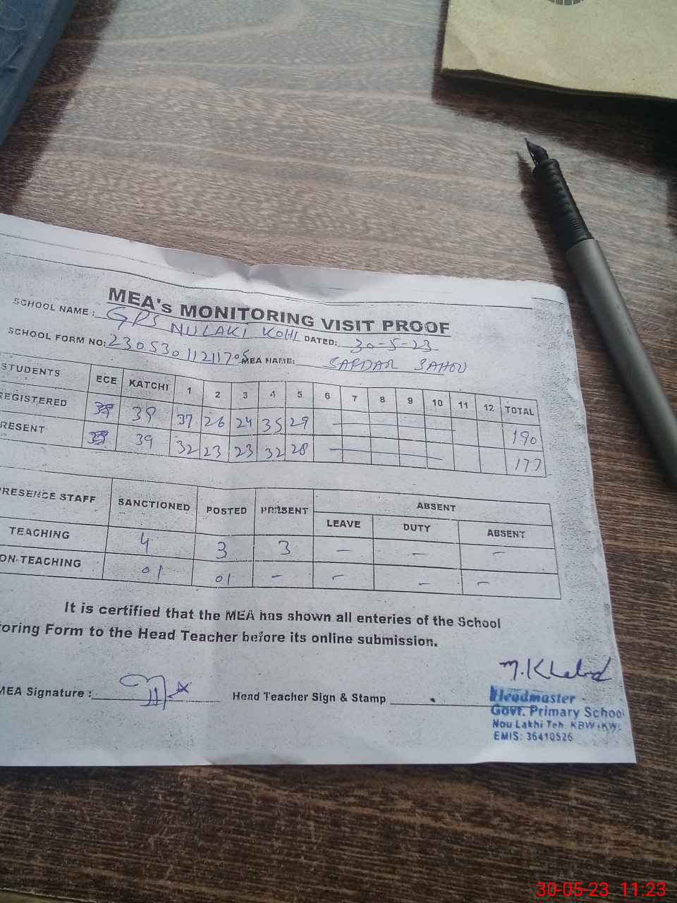 | Attendance Register | Head Teacher | MEA with School | Visit Proof |