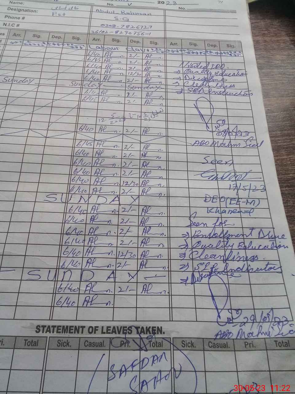 | CNIC | Full Name | Designation | R/C | Absence During Last Calender Month |