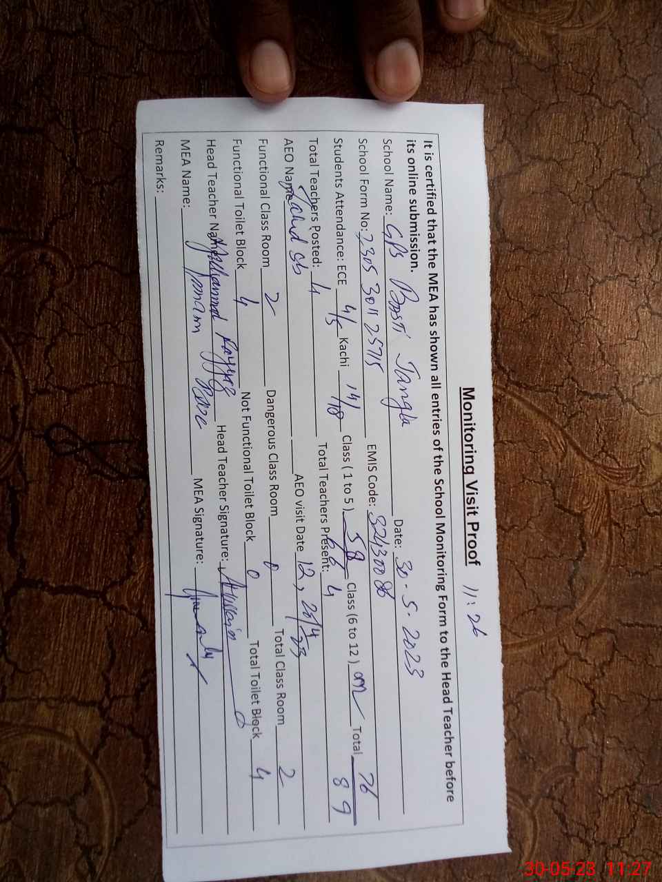 | Attendance Register | Head Teacher | MEA with School | Visit Proof |