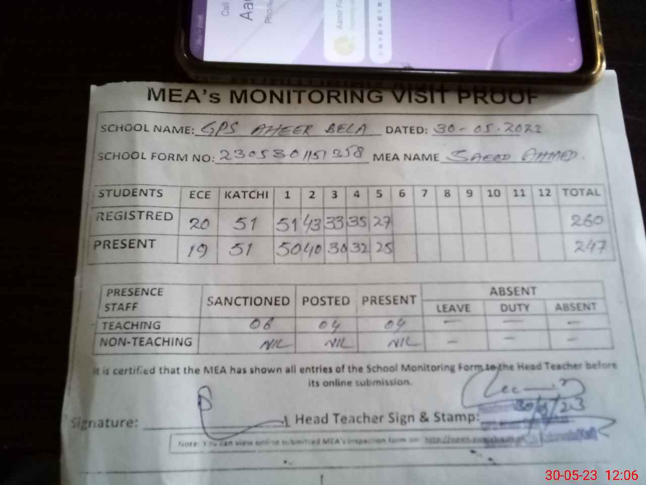 | Attendance Register | Head Teacher | MEA with School | Visit Proof |