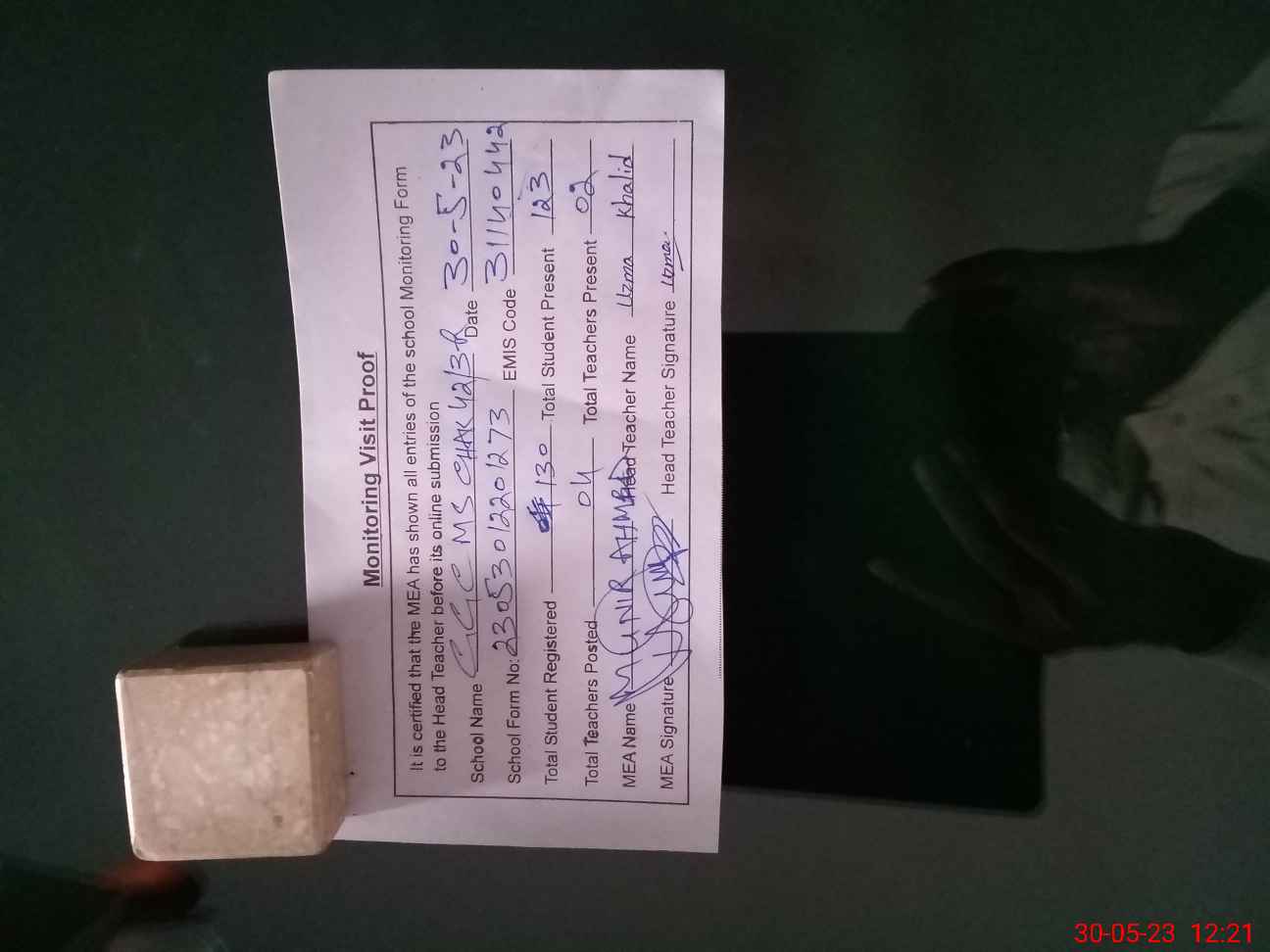 | Name: UZ**** KH**** Designation: (School Headmaster's/Headmistress's) Pst Phone/Cell Number: 03**** |