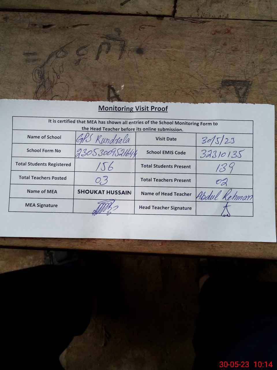 | Attendance Register | Head Teacher | MEA with School | Visit Proof |