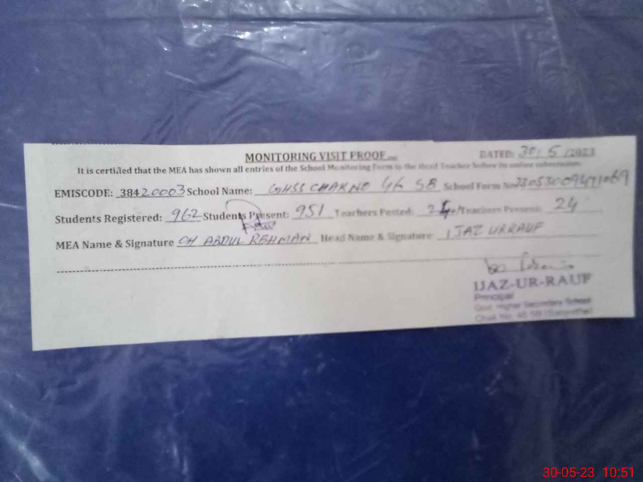 | Certified that this School was Inspected by the Undersigned MEA/DMO Today and the Information Stated Above is as Per Record. | |||||