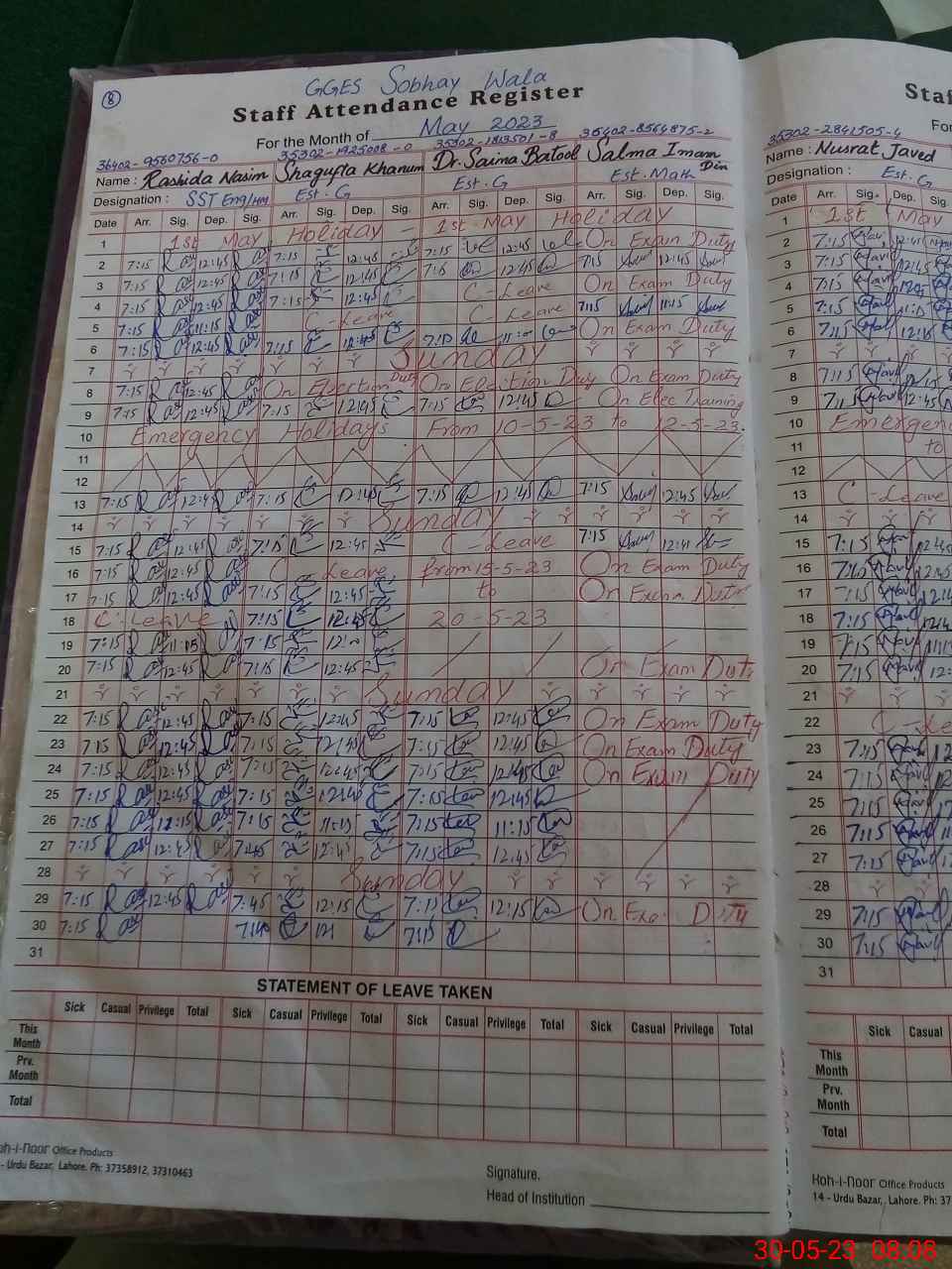 | 36**** | Sa**** Im**** Di**** | EST | Regular | 0 | 0 | 0 | 0 | 0 | 0 | 0 | 0 | 0 | Exam Duty |