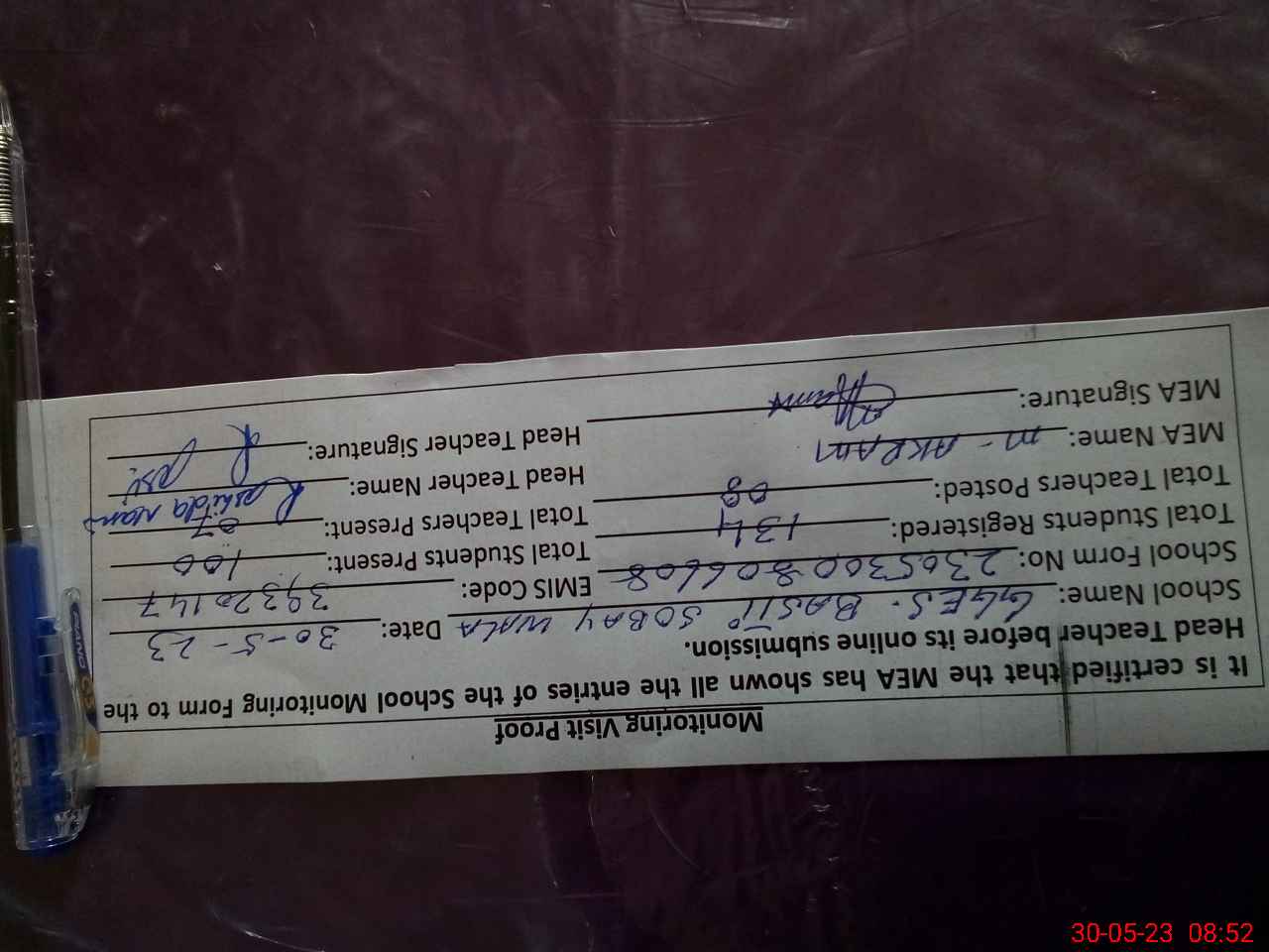 | Attendance Register | Head Teacher | MEA with School | Visit Proof |