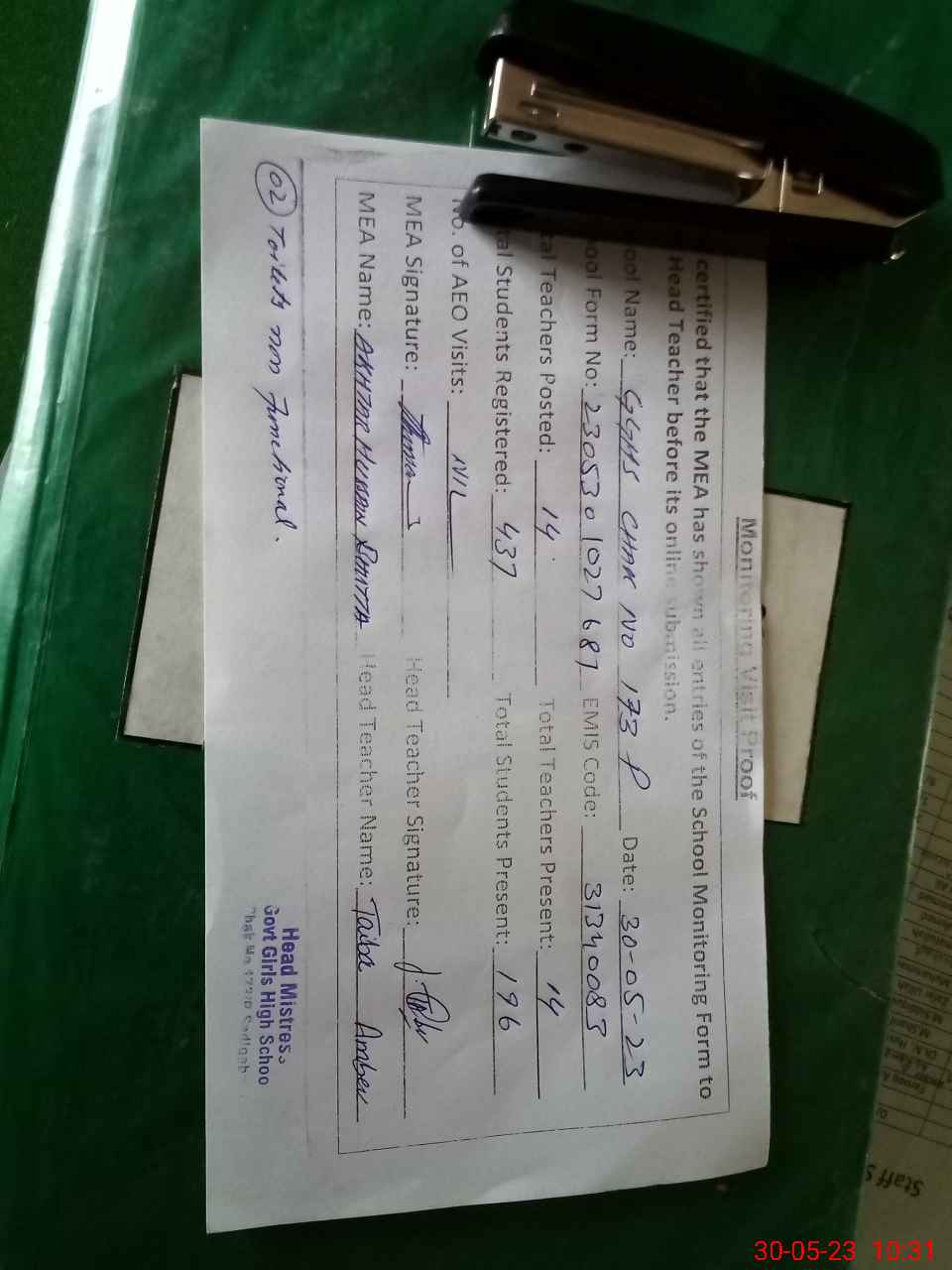 | Attendance Register | Head Teacher | MEA with School | Visit Proof |