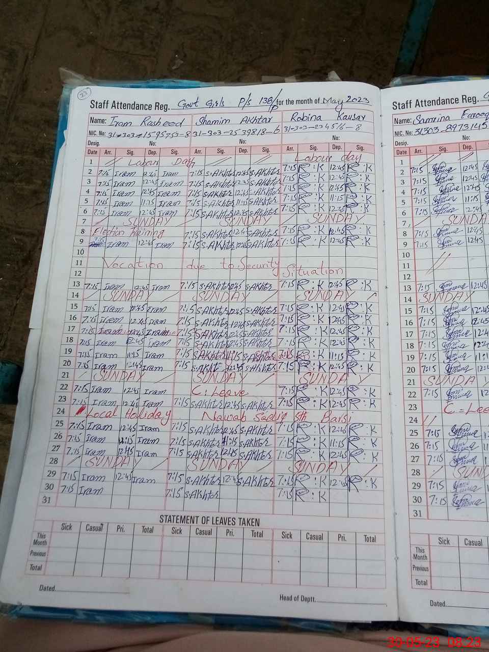 | CNIC | Full Name | Designation | R/C | Absence During Last Calender Month |