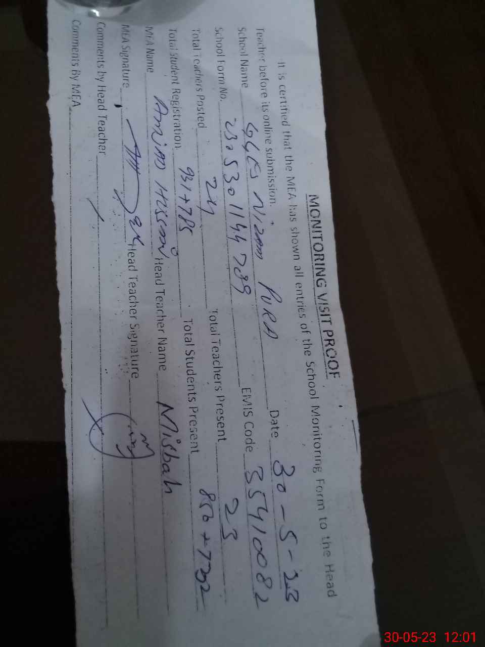 | Attendance Register | Head Teacher | MEA with School | Visit Proof |