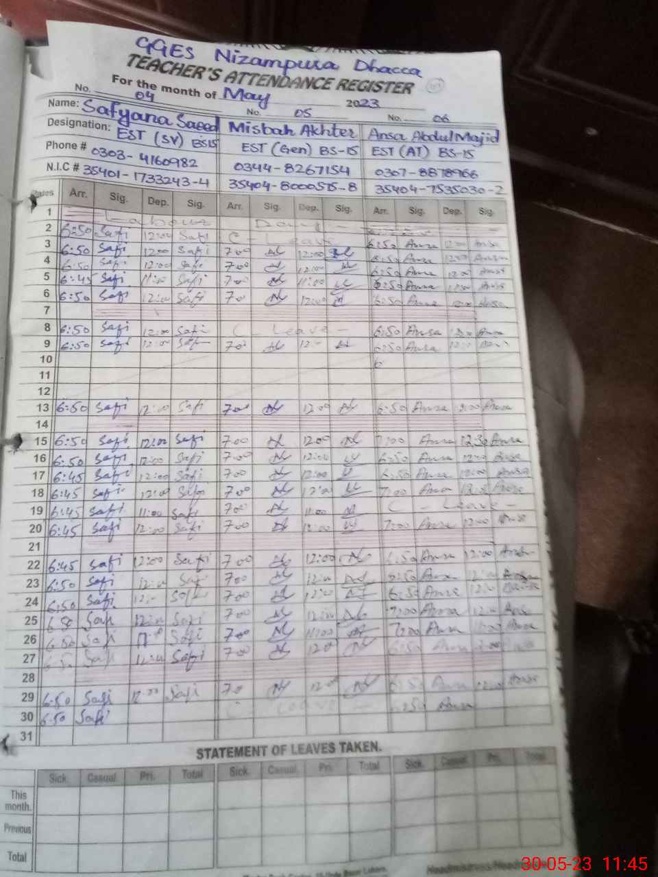 | CNIC | Full Name | Designation | R/C | Absence During Last Calender Month |