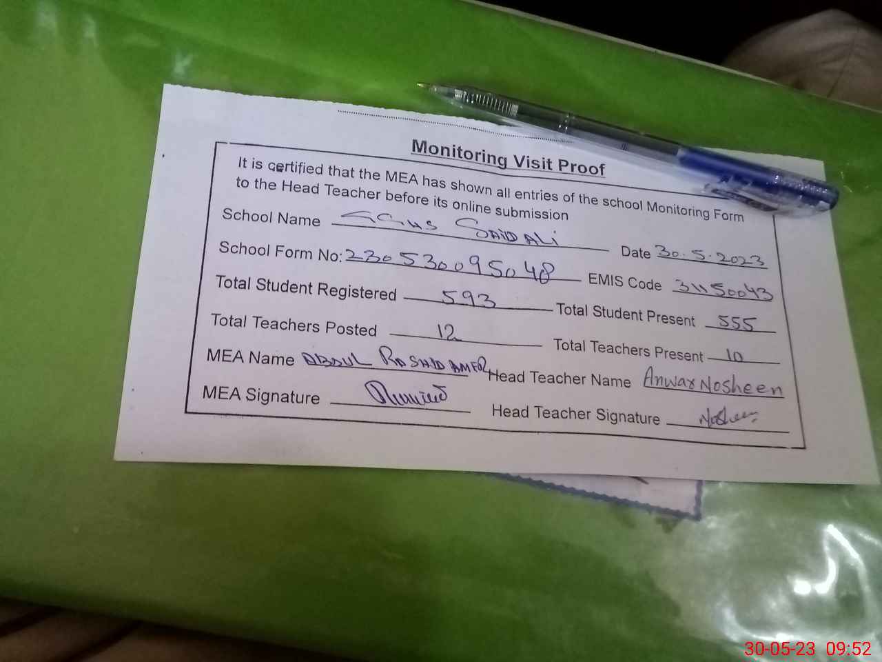 | Certified that this School was Inspected by the Undersigned MEA/DMO Today and the Information Stated Above is as Per Record. | |||||