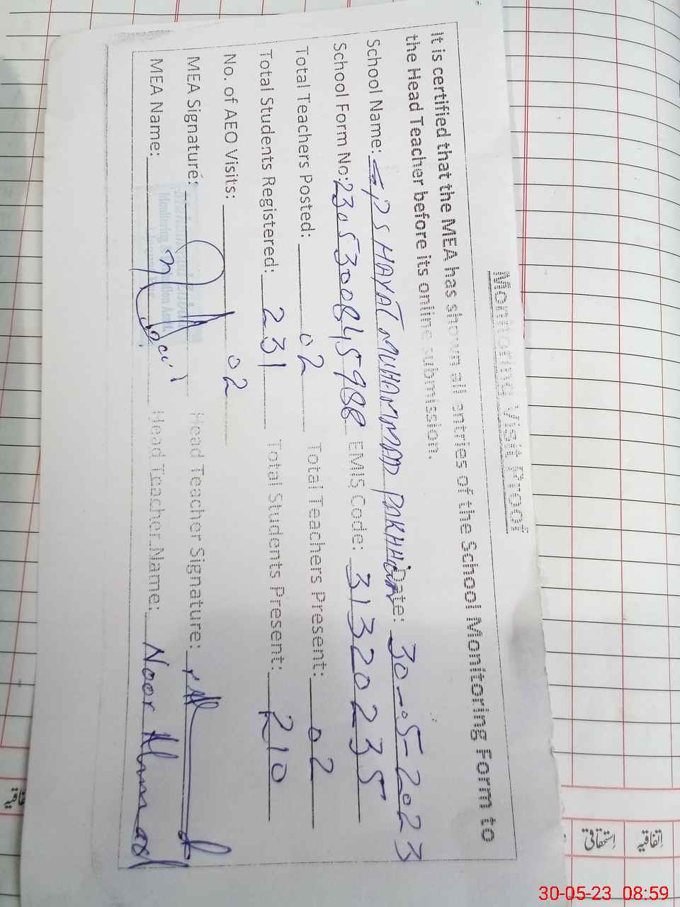| Name: NO**** AH**** Designation: (School Headmaster's/Headmistress's) PST/PTC/JV Phone/Cell Number: 03**** |