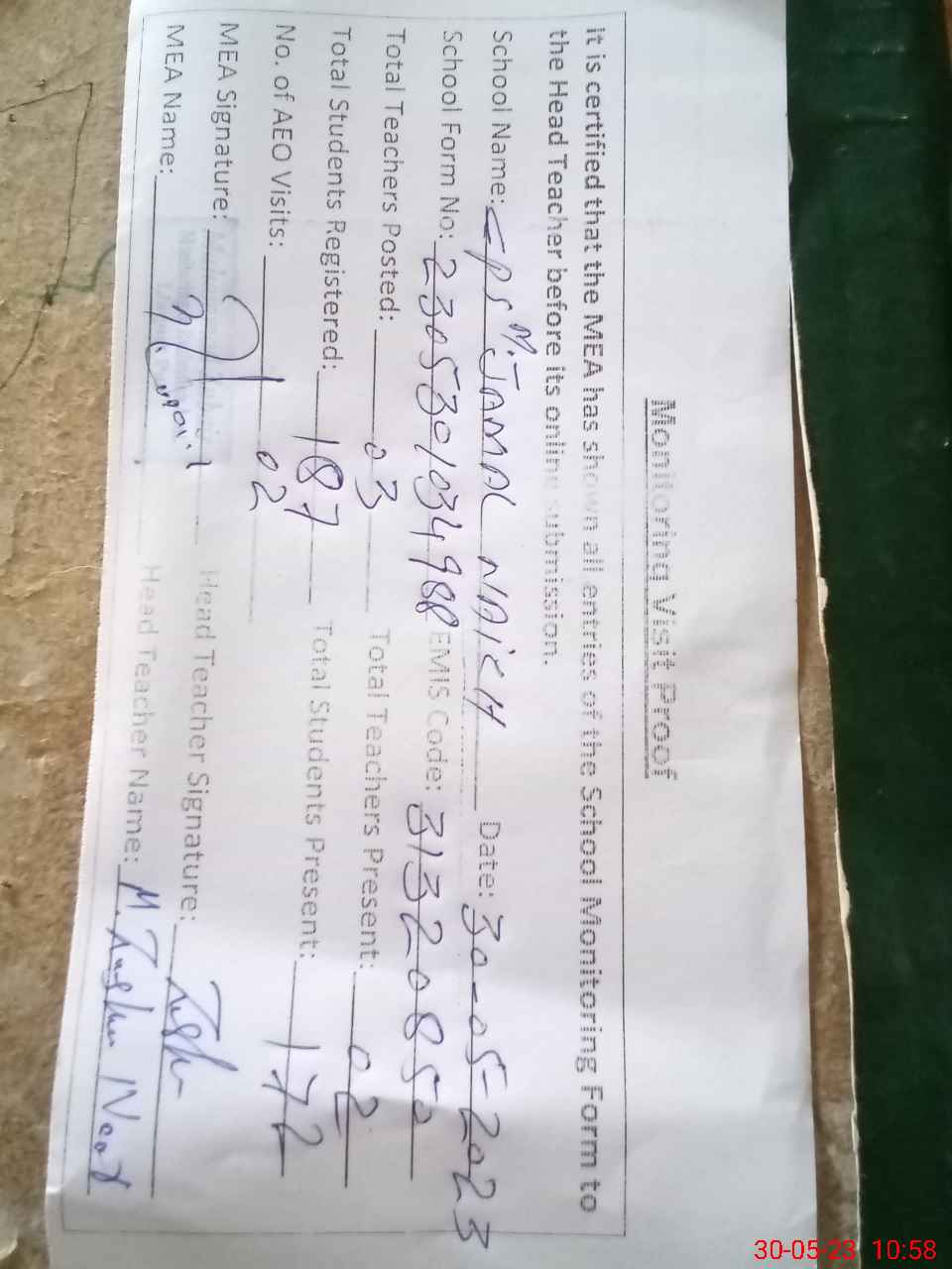 | Attendance Register | Head Teacher | MEA with School | Visit Proof |