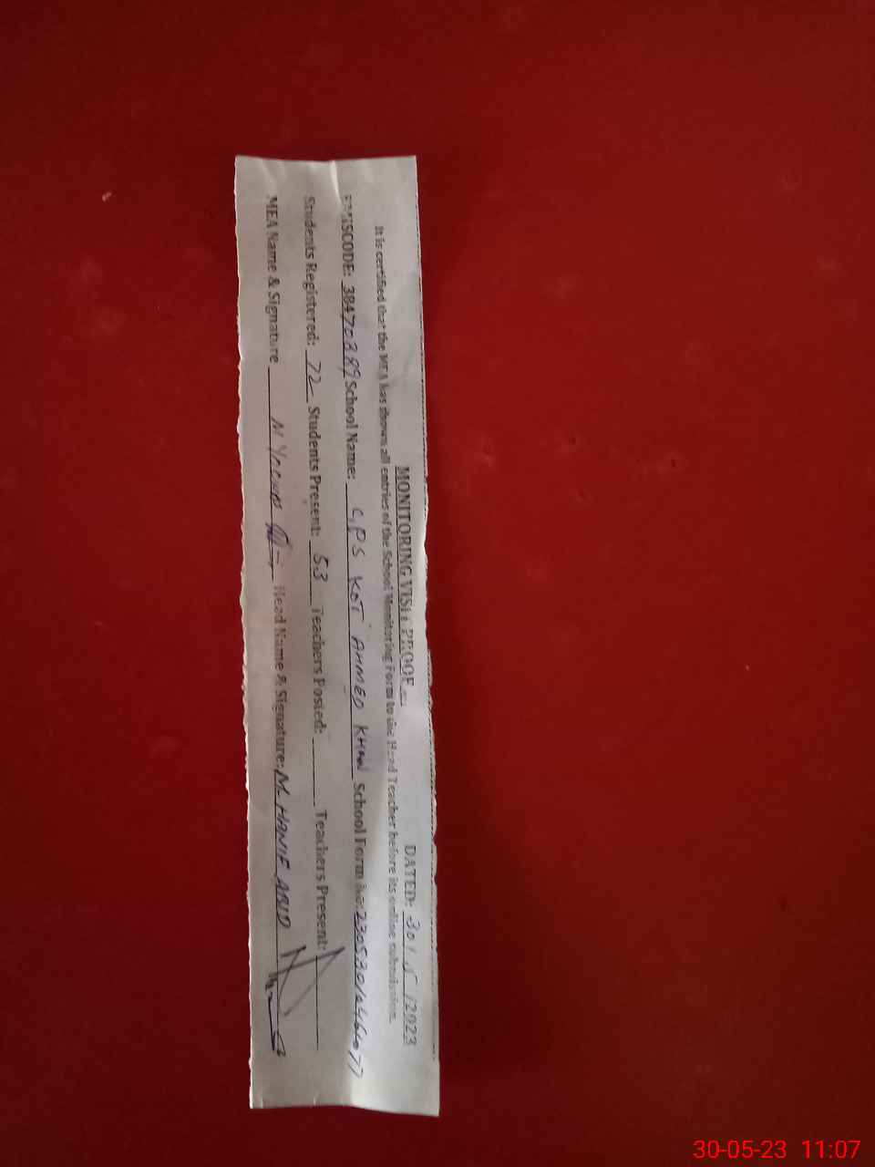 | Attendance Register | Head Teacher | MEA with School | Visit Proof |