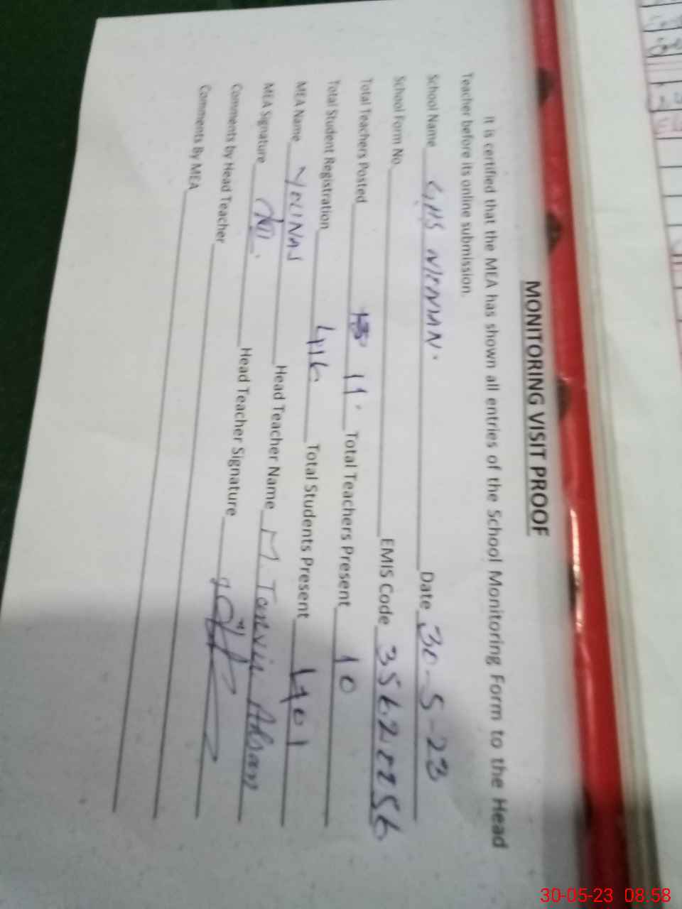 | Attendance Register | Head Teacher | MEA with School | Visit Proof |