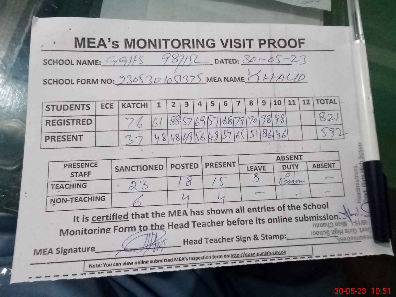| Attendance Register | Head Teacher | MEA with School | Visit Proof |