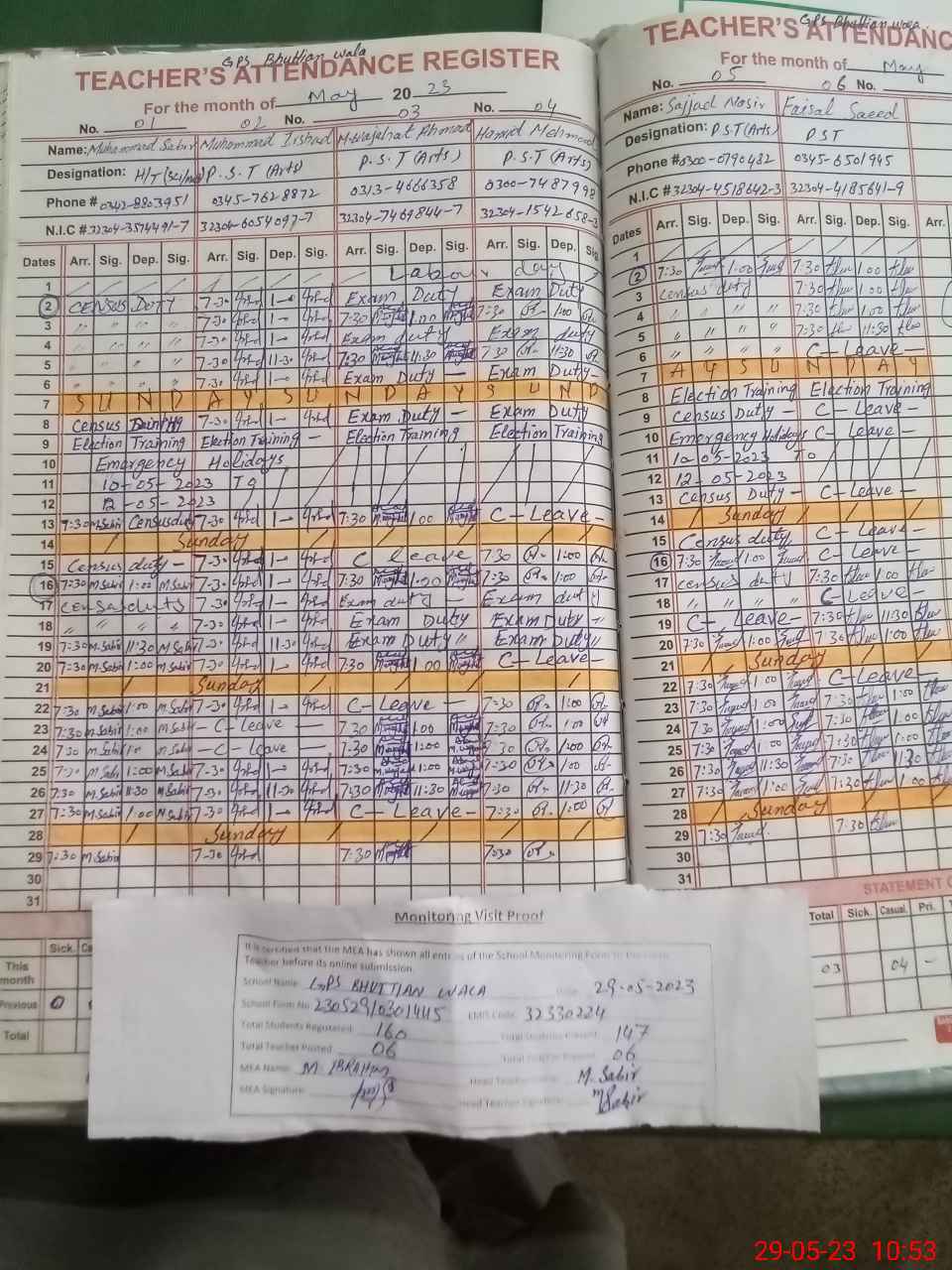 | Attendance Register | Head Teacher | MEA with School | Visit Proof |
