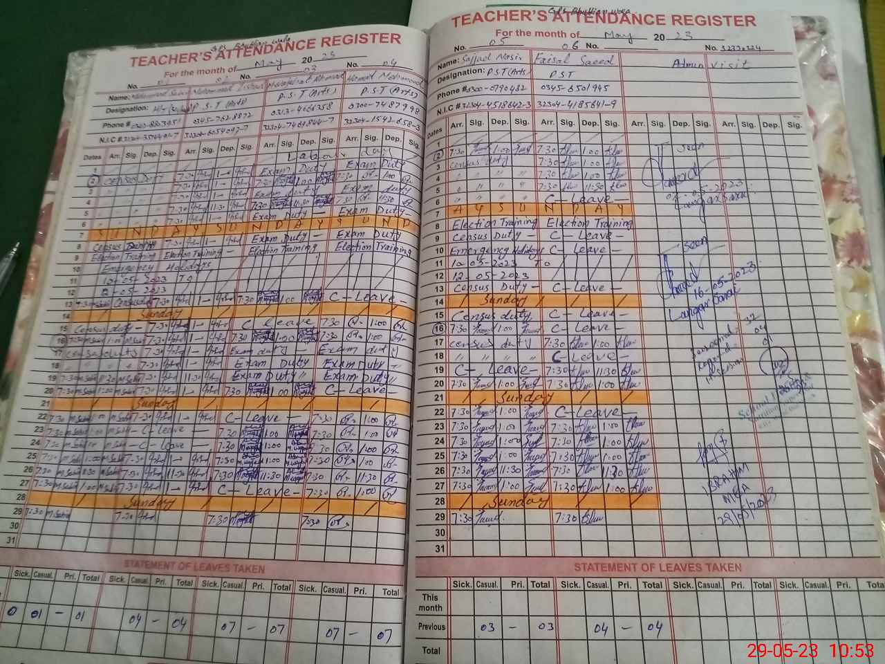 | CNIC | Full Name | Designation | R/C | Absence During Last Calender Month |