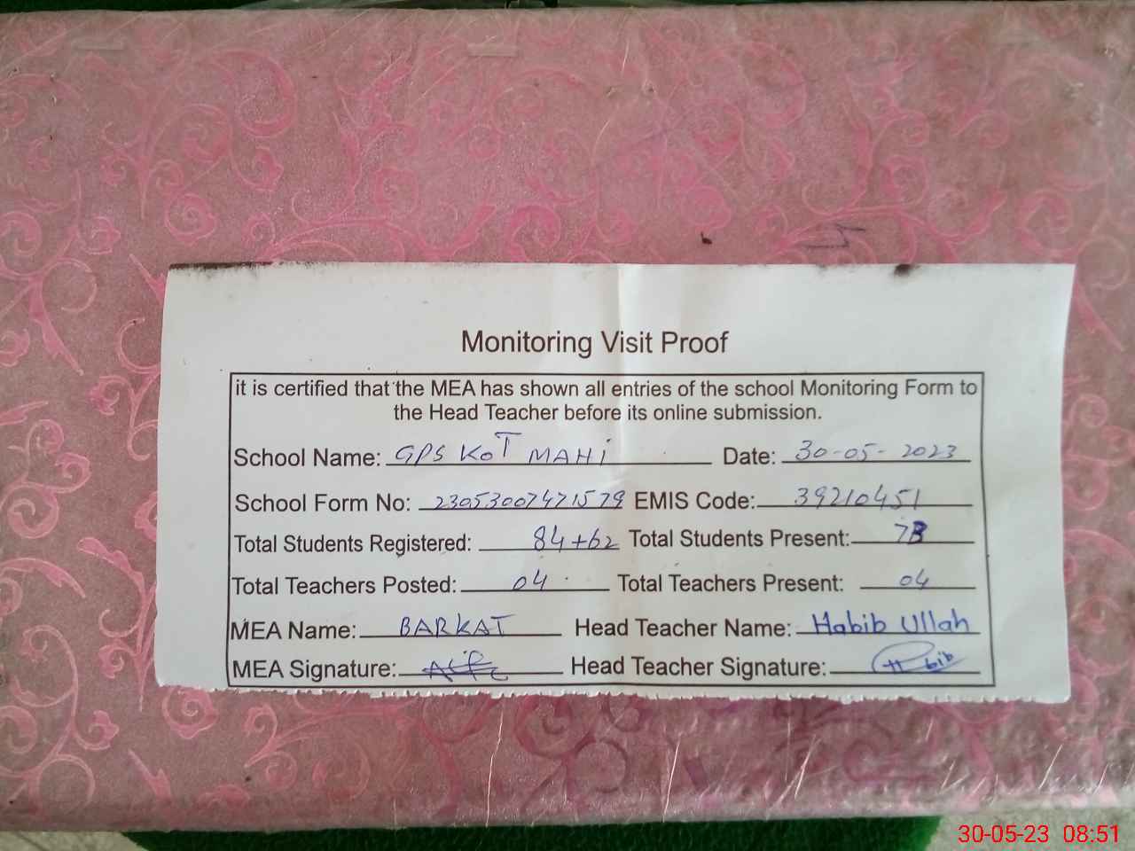 | Attendance Register | Head Teacher | MEA with School | Visit Proof |