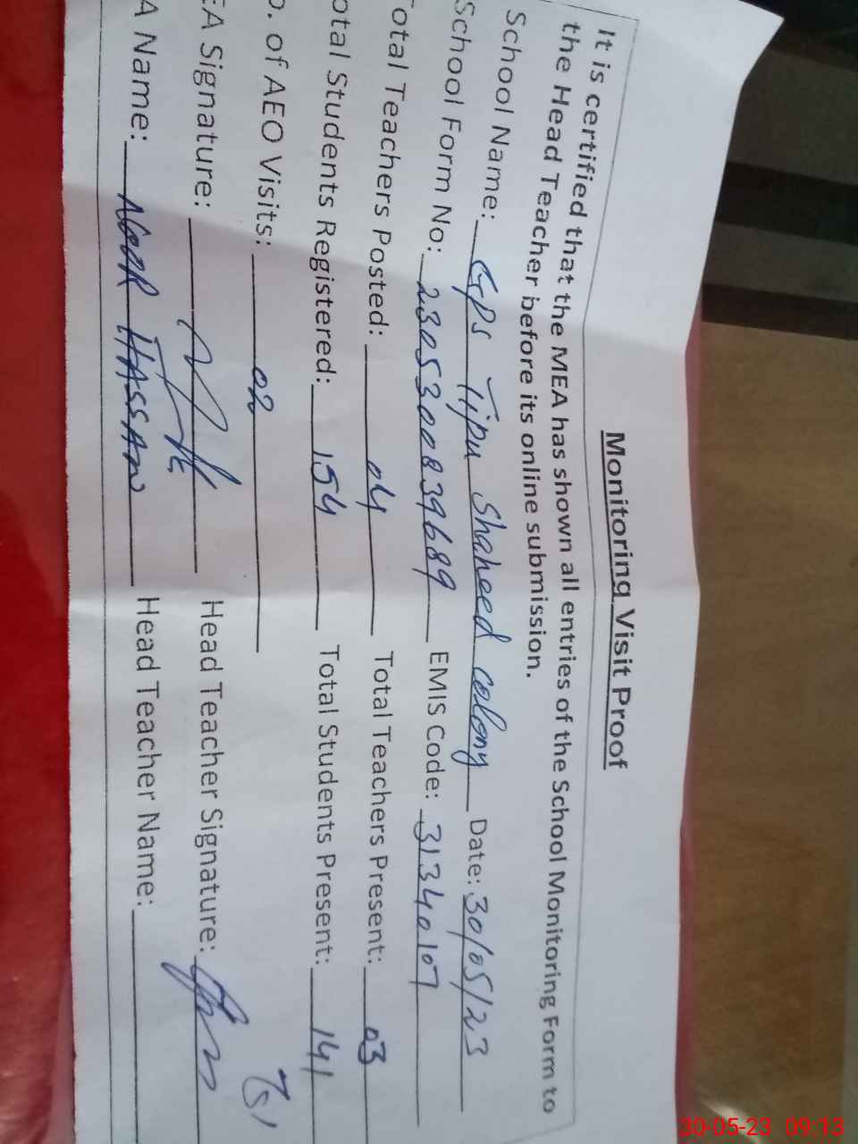 | Attendance Register | Head Teacher | MEA with School | Visit Proof |