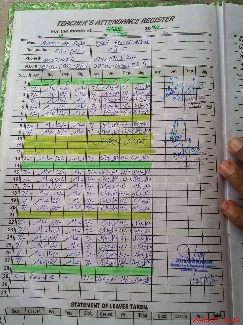 | CNIC | Full Name | Designation | R/C | Absence During Last Calender Month |