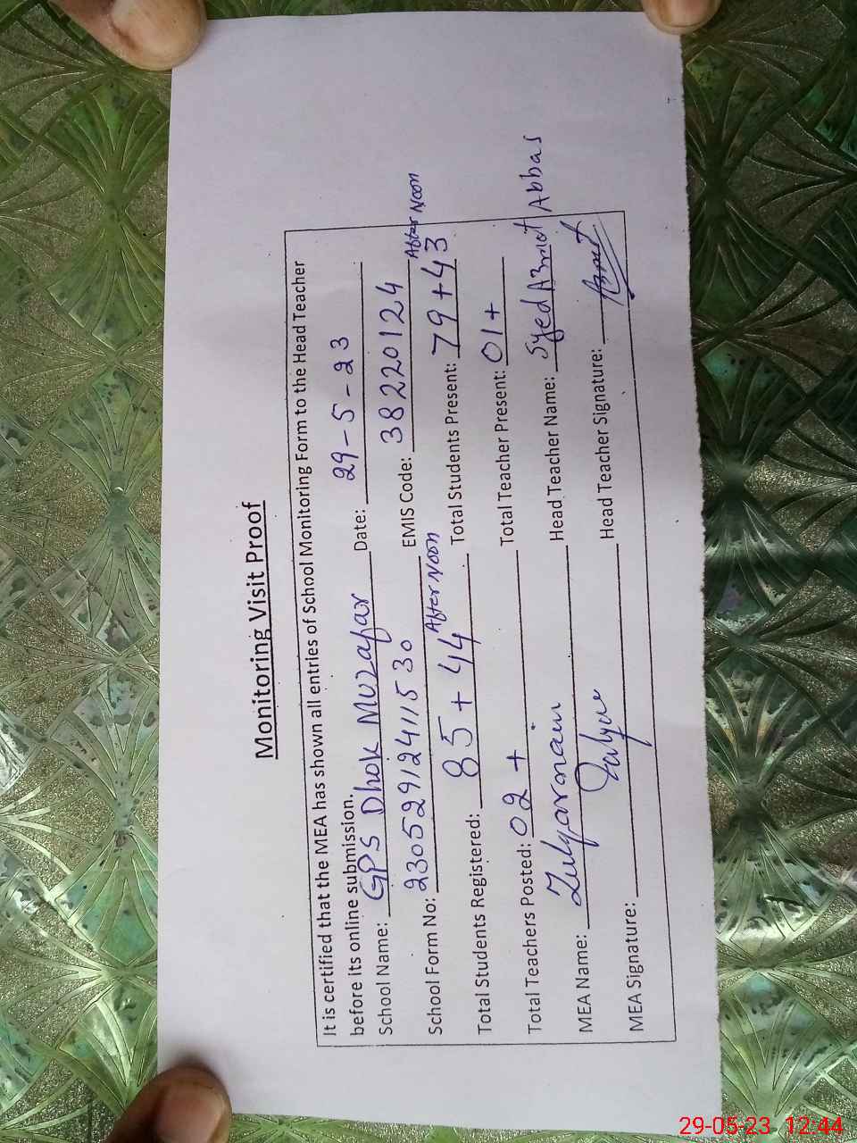 | Attendance Register | Head Teacher | MEA with School | Visit Proof |