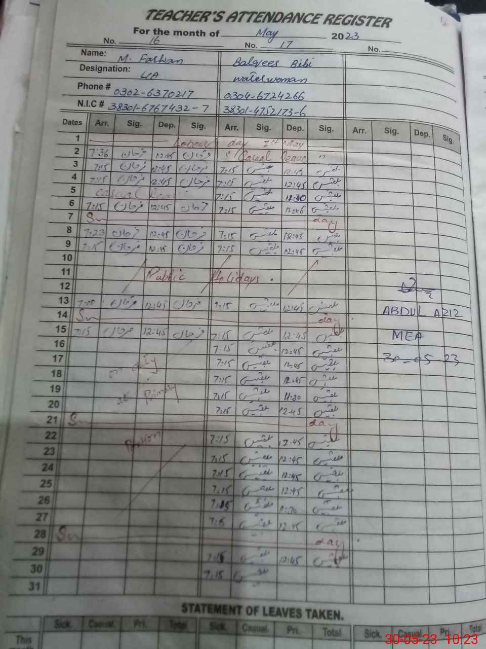 | CNIC | Full Name | Designation | R/C | Absence During Last Calender Month |