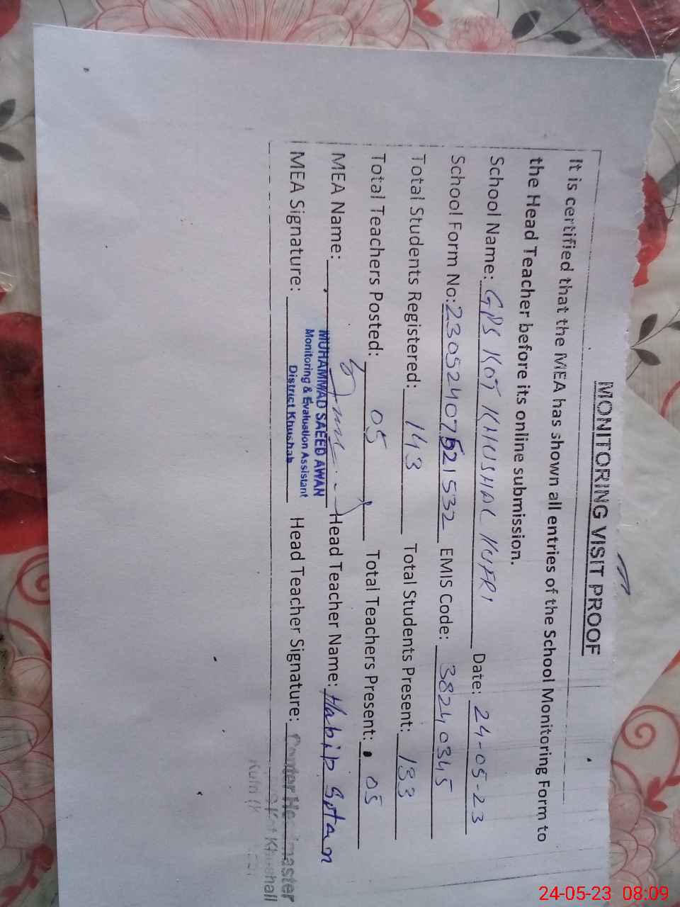| EMIS Code: 38240345 | Name of School: GPS KOT KHUSHAL | |||