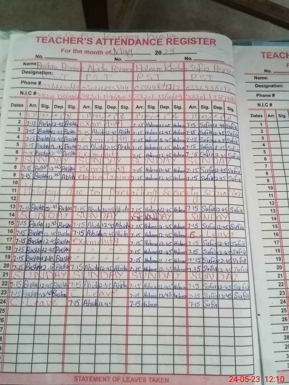 | CNIC | Full Name | Designation | R/C | Absence During Last Calender Month |