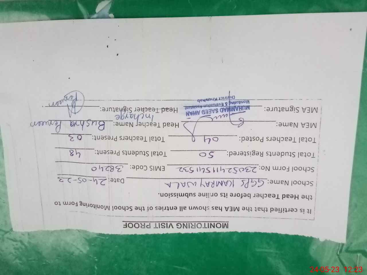 | Certified that this School was Inspected by the Undersigned MEA/DMO Today and the Information Stated Above is as Per Record. | |||||