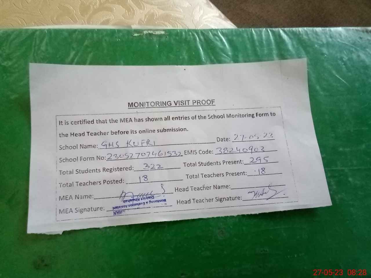 | Attendance Register | Head Teacher | MEA with School | Visit Proof |