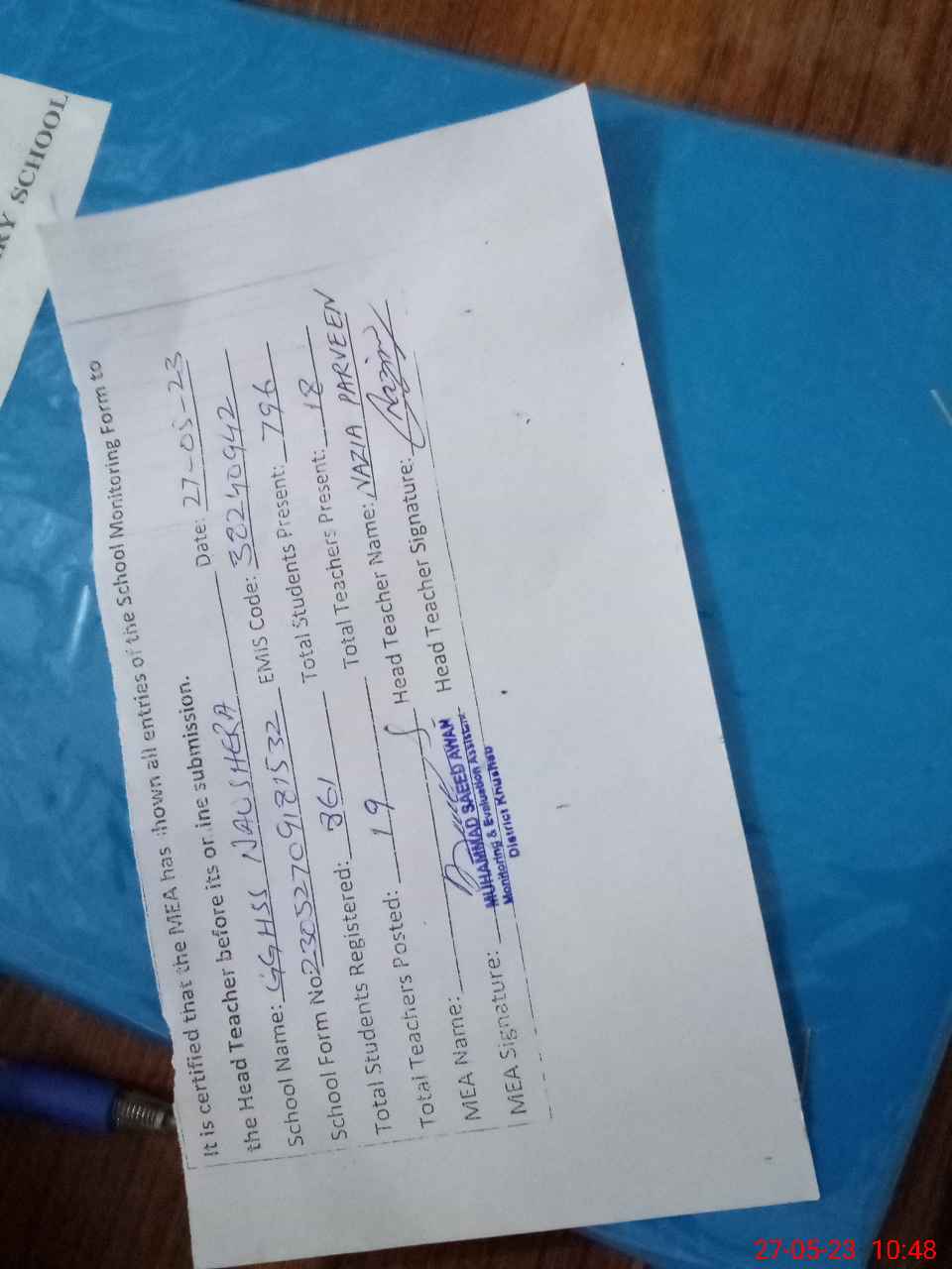 | Certified that this School was Inspected by the Undersigned MEA/DMO Today and the Information Stated Above is as Per Record. | |||||