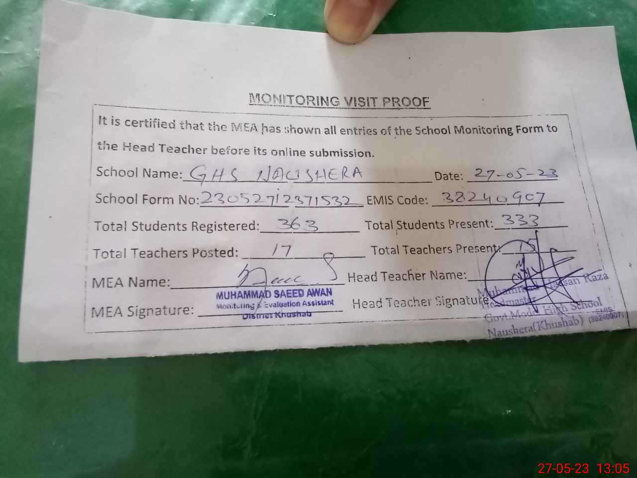 | Attendance Register | Head Teacher | MEA with School | Visit Proof |