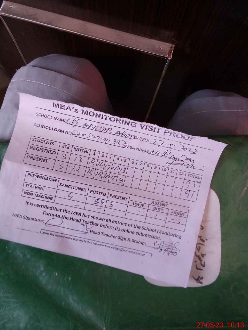 | Attendance Register | Head Teacher | MEA with School | Visit Proof |