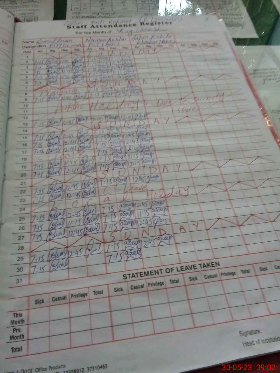 | CNIC | Full Name | Designation | R/C | Absence During Last Calender Month |