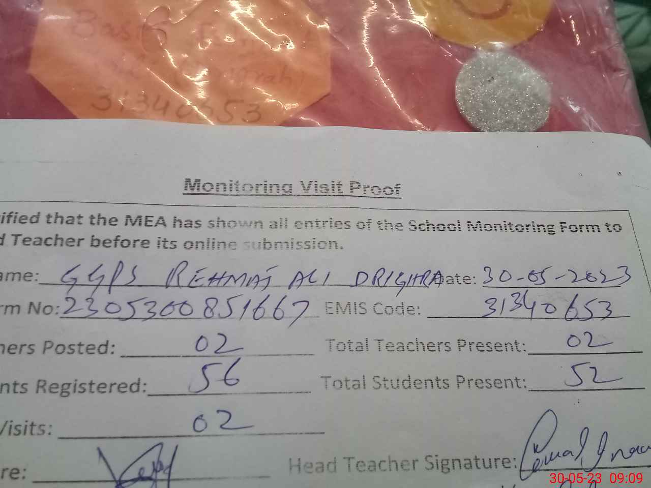 | Attendance Register | Head Teacher | MEA with School | Visit Proof |