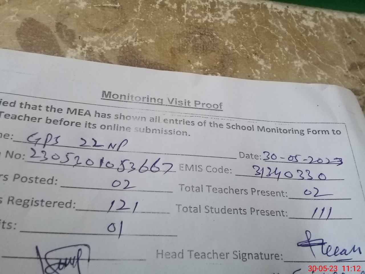 | EMIS Code: 31340330 | Name of School: GPS CHAK NO 22/NP | |||