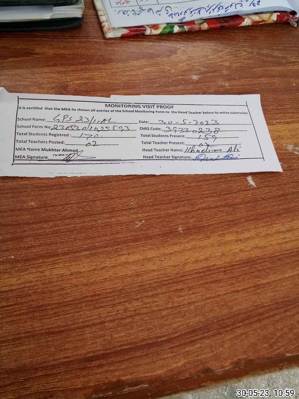 | Attendance Register | Head Teacher | MEA with School | Visit Proof |